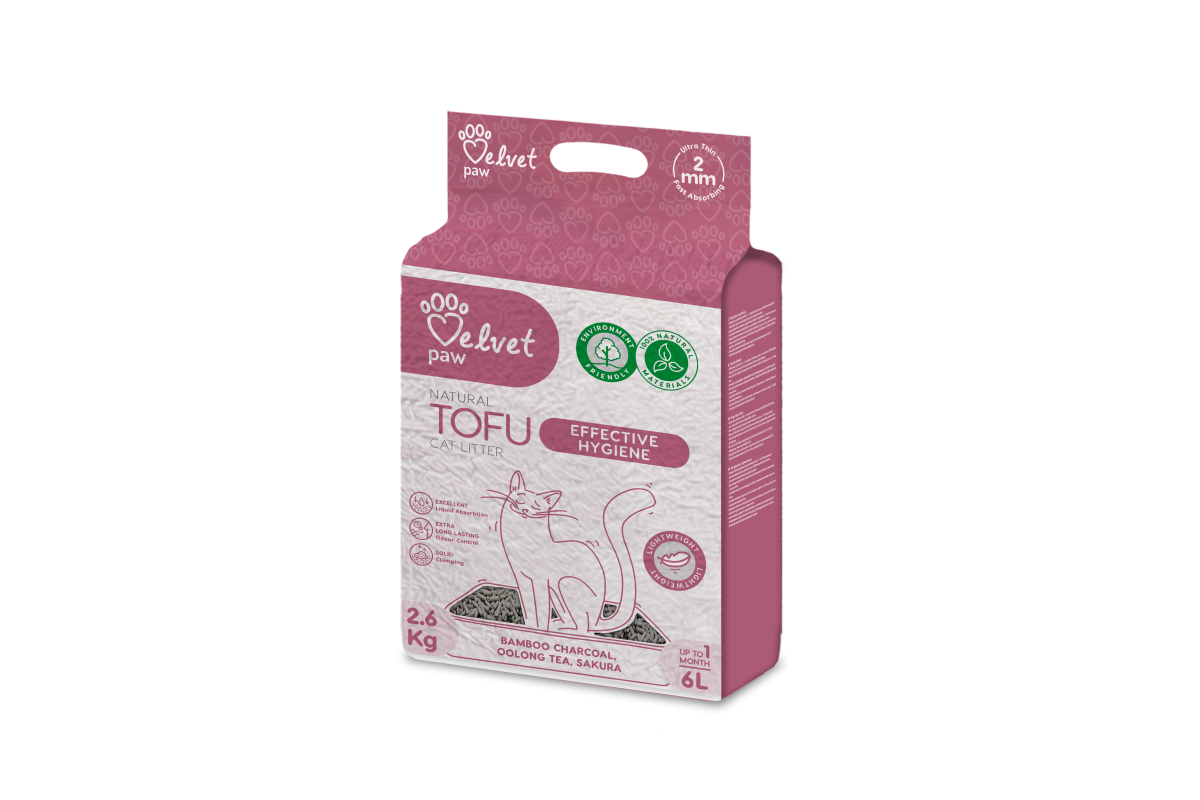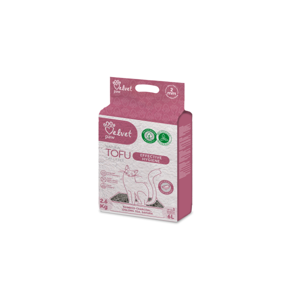 VELVET PAW TOFU cat litter for active hygiene with bamboo charcoal, oolong tea, and sakura essence is made from 100% natural pea cellulose, without any synthetic additives or dyes. It rapidly absorbs moisture, neutralises unpleasant odors, and is exceptionally gentle on your cat's sensitive paws.