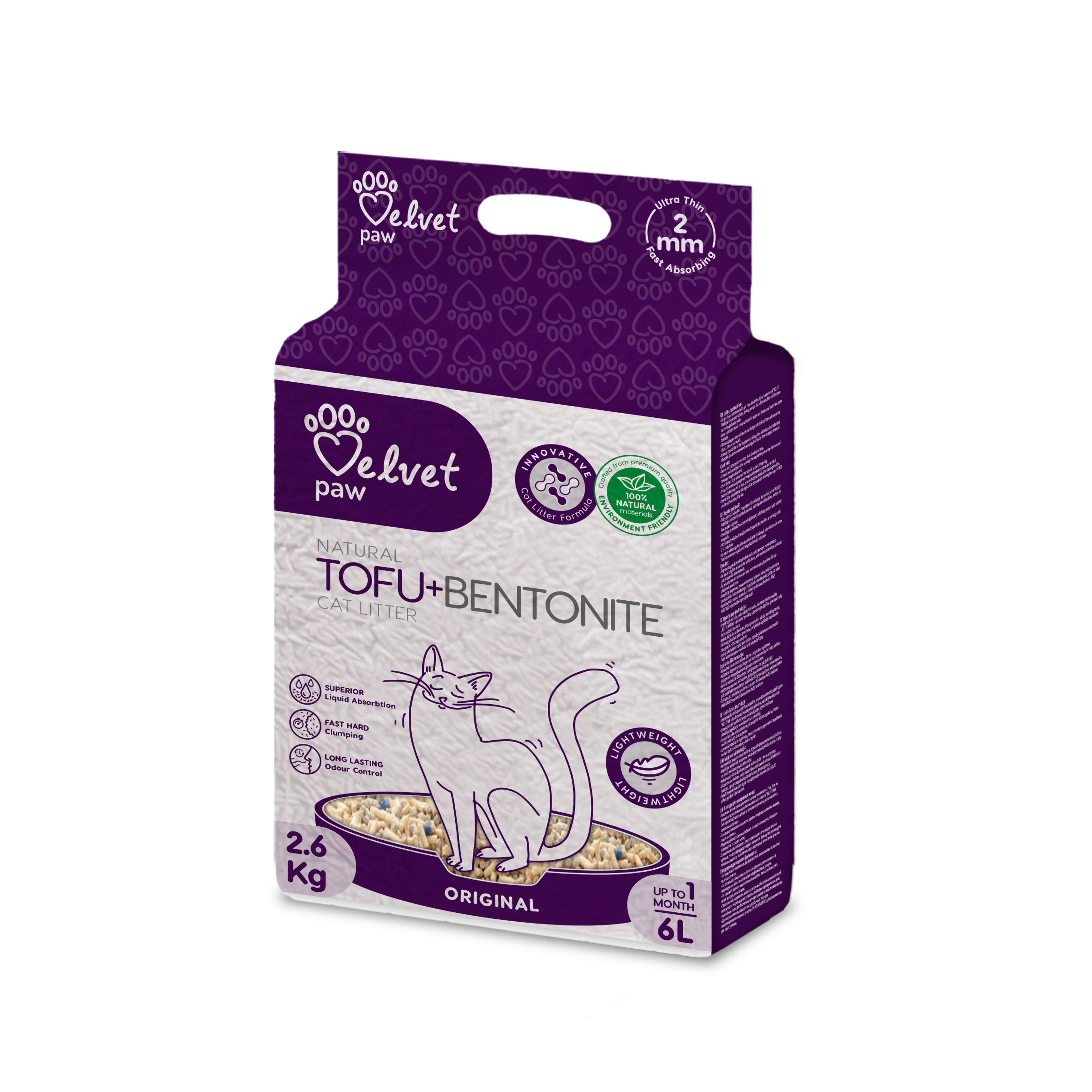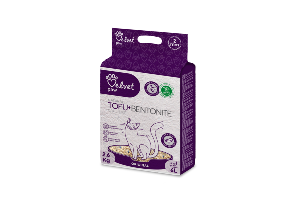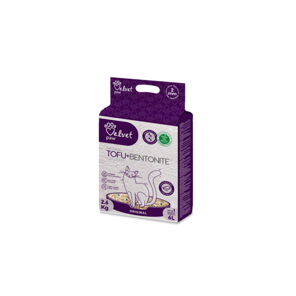 Description Enhance your pet's litter box experience with our innovative litter mix! VELVET PAW TOFU + BENTONITE cat litter is made from 100% natural materials: pea fiber, starch, bentonite, with no synthetic additives or dyes. It quickly absorbs moisture, neutralizes unpleasant odors, and is especially gentle on your cat's sensitive paws.