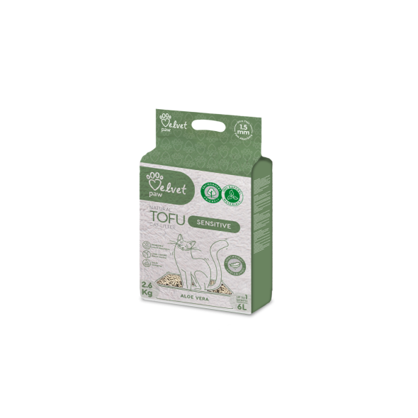 VELVET PAW TOFU sensitive cat litter with aloe essence is made from 100% natural pea cellulose, without any synthetic additives or dyes. It rapidly absorbs moisture, neutralises unpleasant odors, and is exceptionally gentle on your cat's sensitive paws.