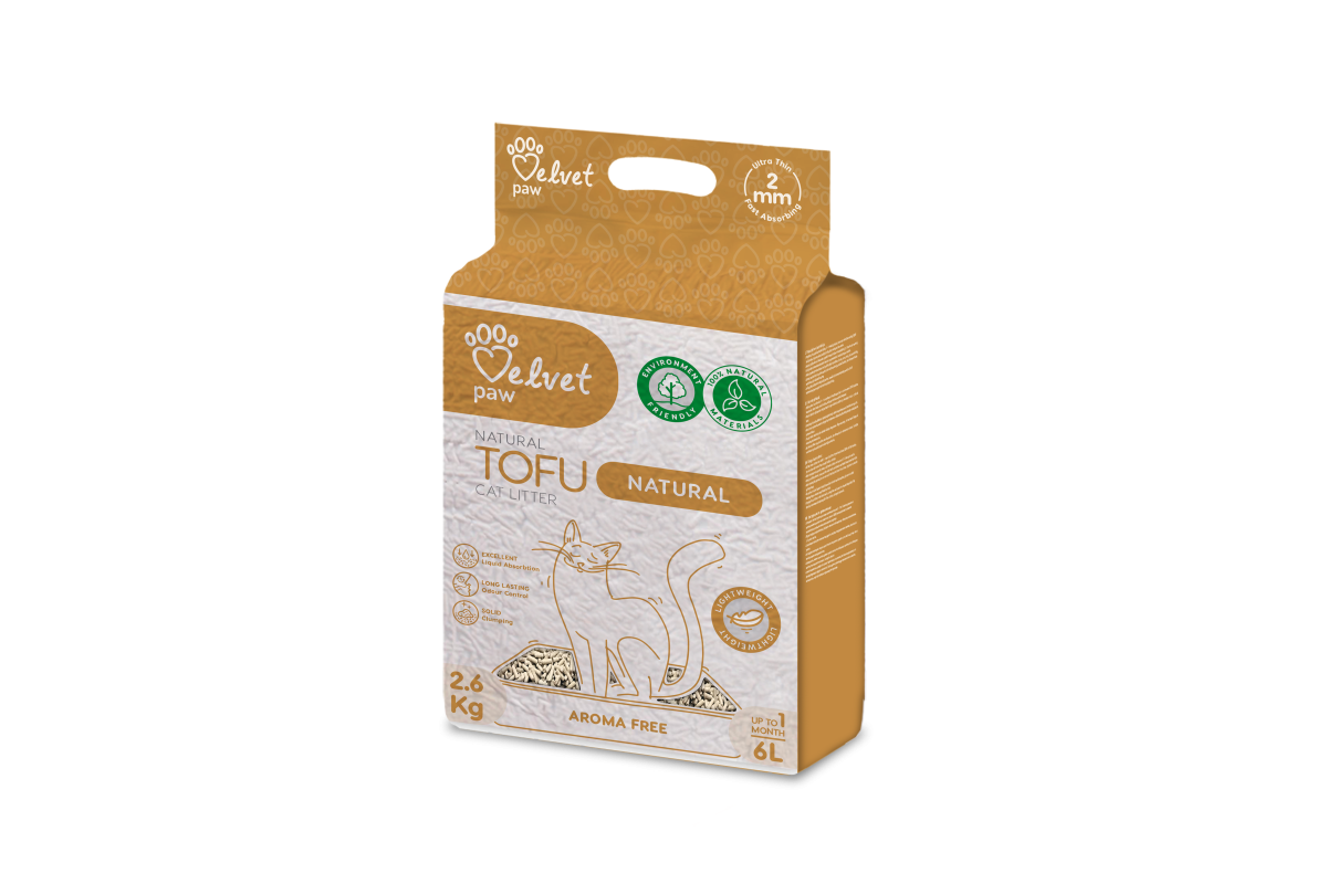 Velvet Paw Tofu is a cat litter made from 100% natural pea fibre, without any synthetic additives or dyes. It rapidly absorbs moisture, neutralises unpleasant odors, and is exceptionally gentle on your cat's sensitive paws.