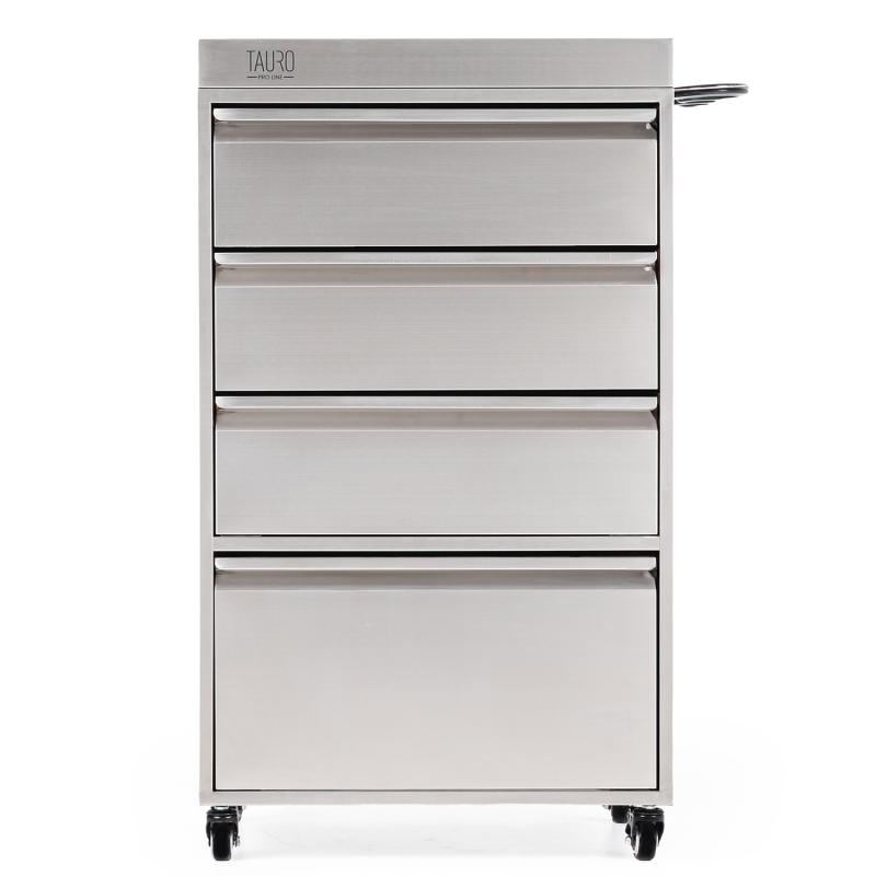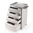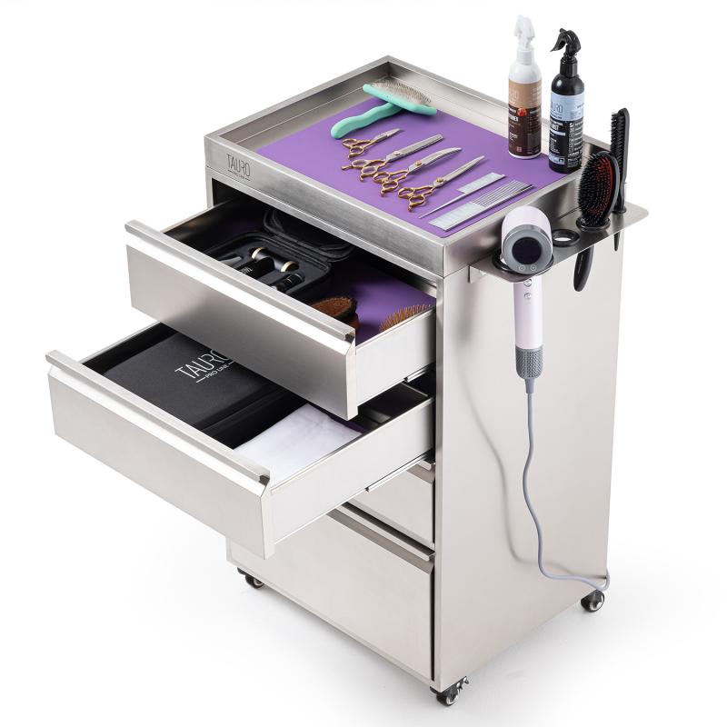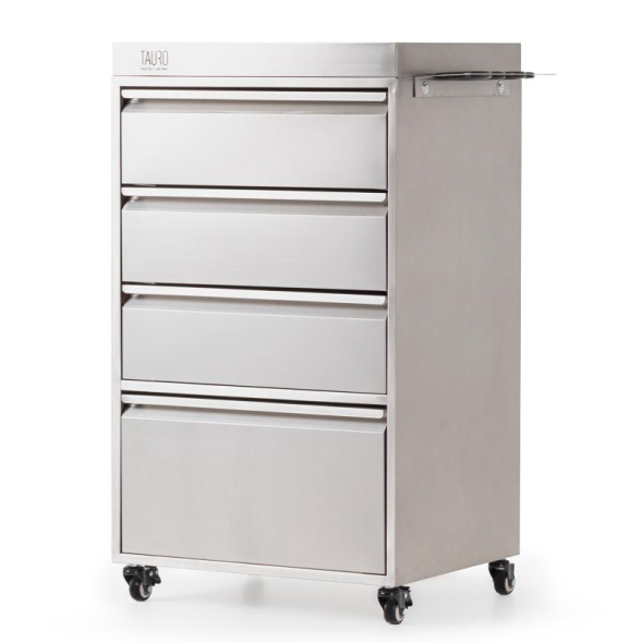 TAURO PRO LINE – high-quality stainless steel cabinet with wheels, drawers, and integrated tool holder – for convenient, hygienic, and professional work.