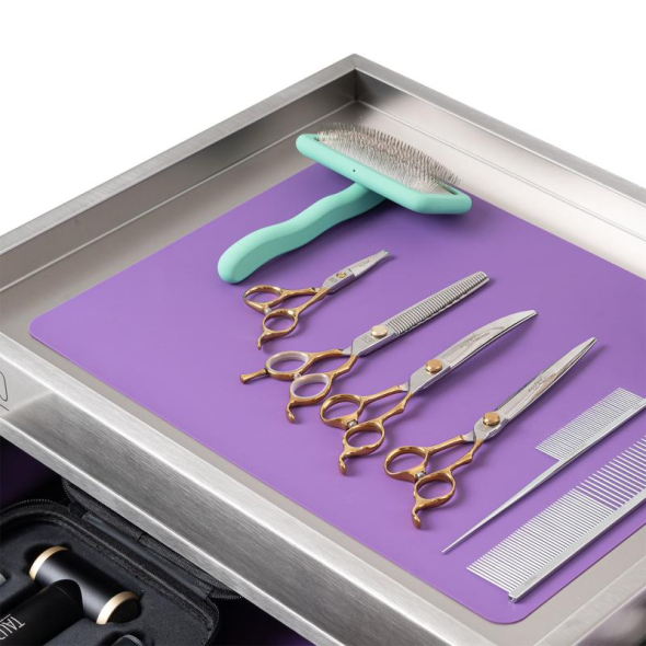 Its four spacious drawers allow you to conveniently store cutting tools, cosmetics, cloths, or other supplies, while the side holder is designed for a dryer, scissors, or spray bottles. The top with a protective rim and non-slip mat helps prevent items from falling when moving. Maneuverable wheels with brakes ensure mobility and stability – you can move the cabinet to where you need it most and lock it in the desired position.