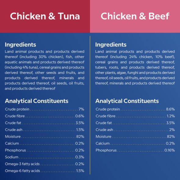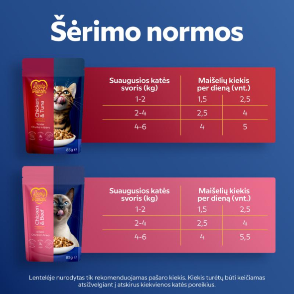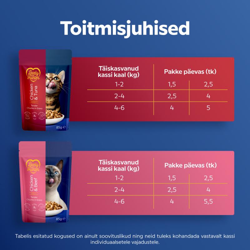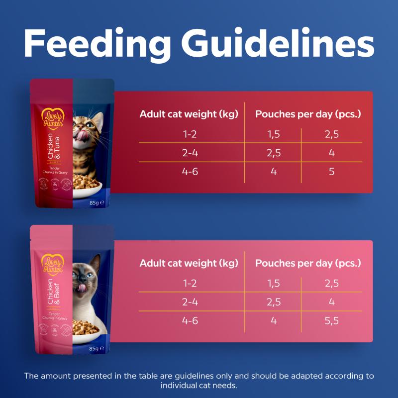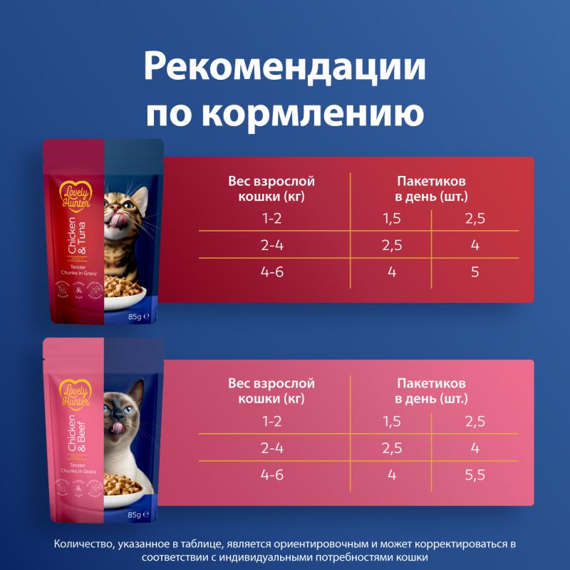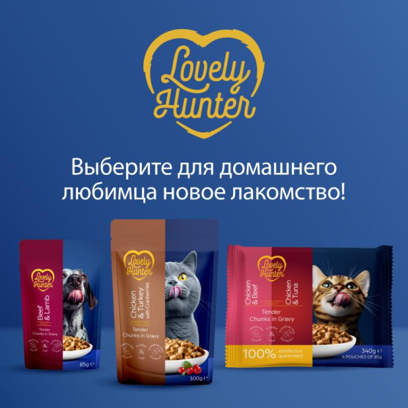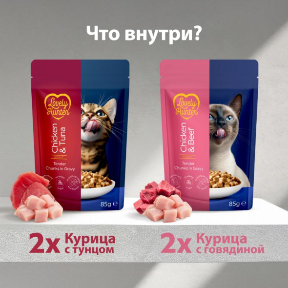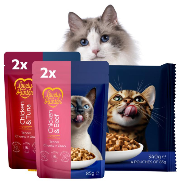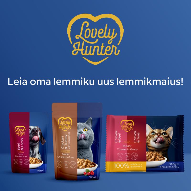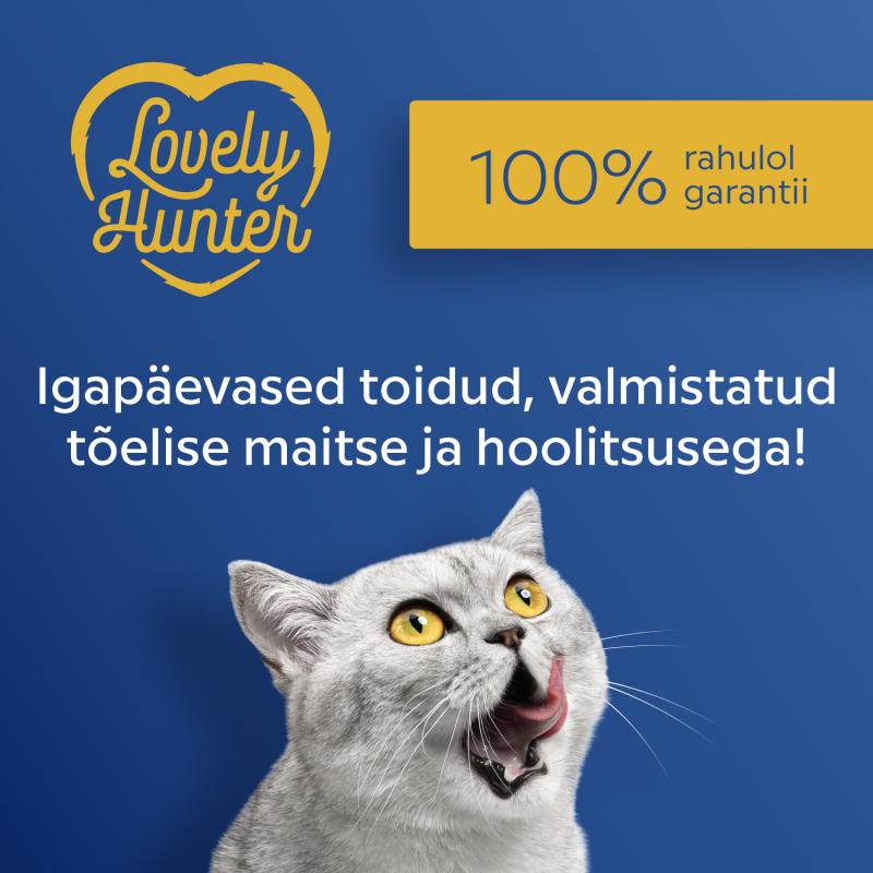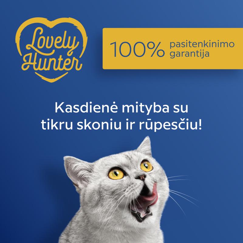 THE TASTE CATS CHOOSE. Lovely Hunter wet food with chicken and beef or chicken and tuna is an everyday solution for adult cats, combining delicious taste, essential proteins, and important nutrients.