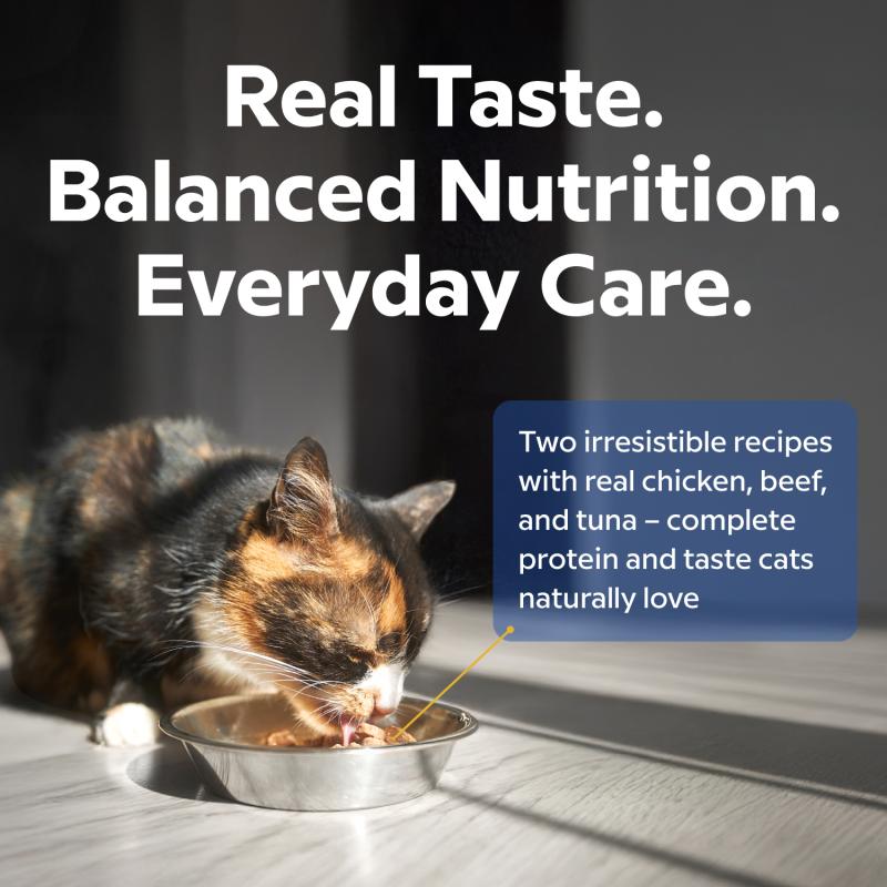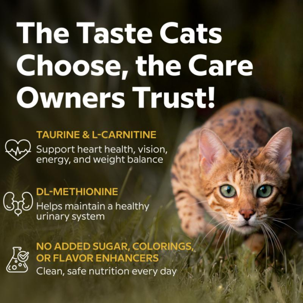 IMPORTANT ELEMENTS FOR DAILY HEALTH. Enriched with taurine, an essential amino acid necessary for cats' vision, heart function, and nervous system. L-carnitine helps maintain proper energy metabolism and weight control, while DL-methionine helps support proper urinary tract health. Vitamins A, D3, and E, as well as minerals, help strengthen the immune system, maintain strong bones, and ensure overall balance in the body.
