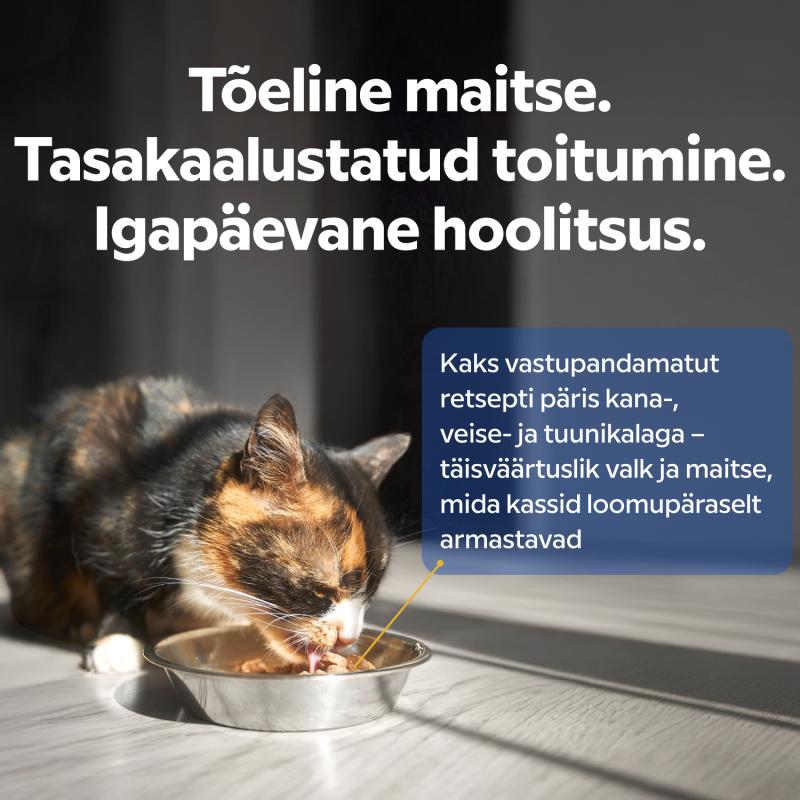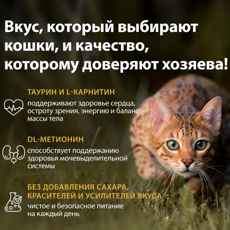 PIECES IN A JUICY SAUCE. High-quality proteins provide the body with nutrients, help maintain energy levels and overall well-being. The sauce helps maintain proper fluid levels in the body, which is especially important for cats that drink less water.