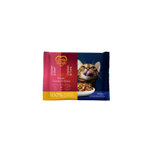 LOVELY HUNTER wet pet food set for adult cats of all breeds with chicken and beef, with chicken and tuna 4x85 g