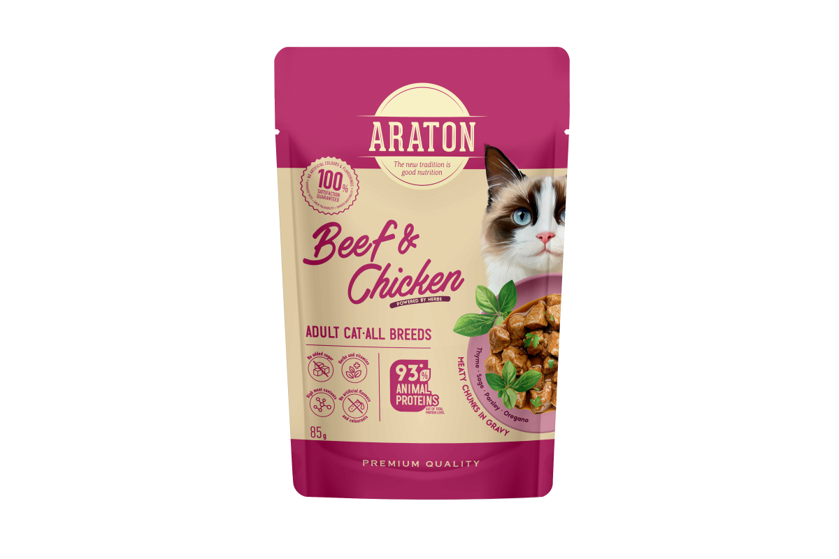 ARATON Complete Wet Food with Beef and Chicken is formulated for adult cats of all breeds, for daily feeding and without excessive additives, but with a beneficial content. Pieces in a succulent sauce, 76% animal ingredients, supplemented with herbs - all designed with the cat's natural instincts in mind and the owner's desire to give what is real.