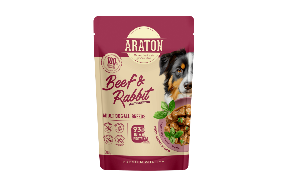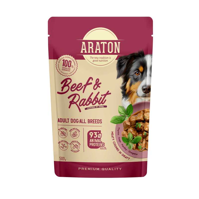 ARATON complete wet food with beef and rabbit - where natural taste meets real value for your dog's health. This food has been developed for adult dogs of all breeds, for daily feeding and without excessive additives, but with a beneficial content.