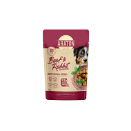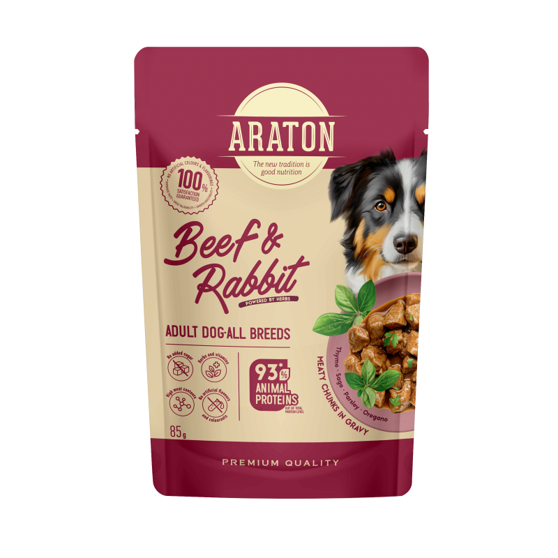 ARATON complete wet food with beef and rabbit - where natural taste meets real value for your dog's health. This food has been developed for adult dogs of all breeds, for daily feeding and without excessive additives, but with a beneficial content. Chunks in a succulent sauce, 78% animal ingredients, supplemented with herbs - all designed with the dog's natural instinct and the owner's desire to give what is real in mind. 93% animal protein - more than just taste.