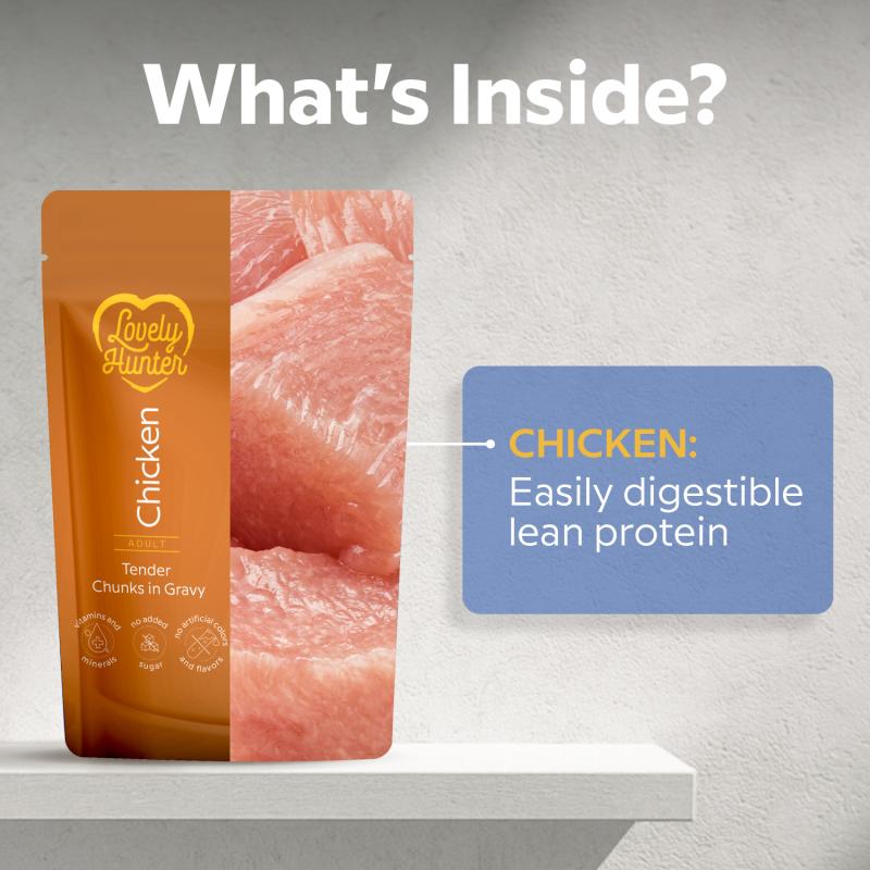 Lovely Hunter wet dog food with chicken is an everyday solution for adult dogs of all breeds, ensuring good taste and the necessary nutrients for your pet to feel good.