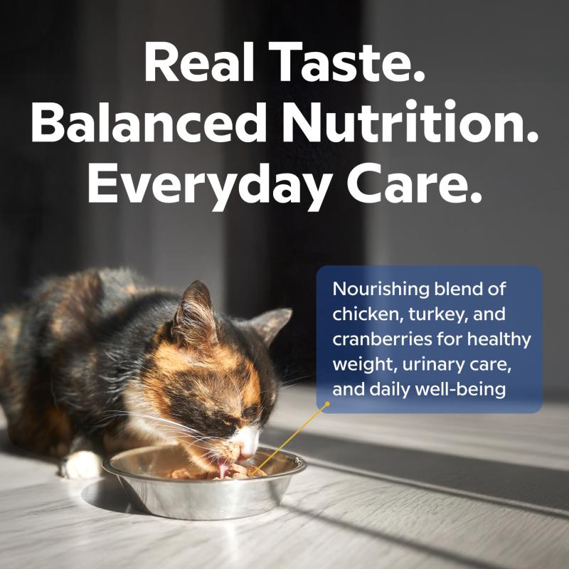 PIECES IN A JUICY SAUCE. Chicken and turkey are easily digestible, high-quality proteins that support muscle tone and energy. Cranberries are a natural ingredient that contributes to urinary tract health, helps maintain proper pH balance, and naturally reduces the growth of unwanted bacteria. The sauce helps maintain proper fluid levels in the body, which is especially important for cats that drink less water.
