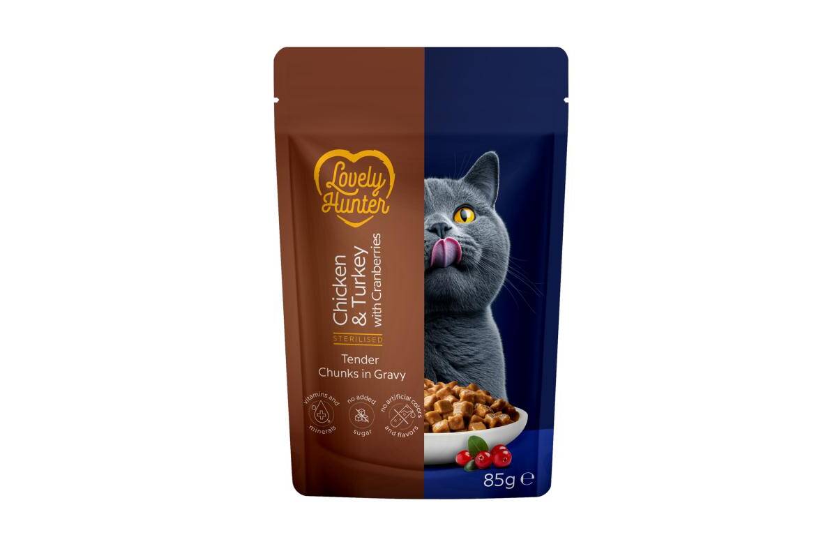 THE TASTE THAT CATS CHOOSE. The diet of sterilized cats requires a special balance – fewer calories, more attention to the urinary system, and overall health. Lovely Hunter wet food with chicken, turkey, and cranberries is designed to contribute to the well-being of sterilized cats every day.