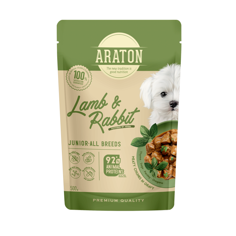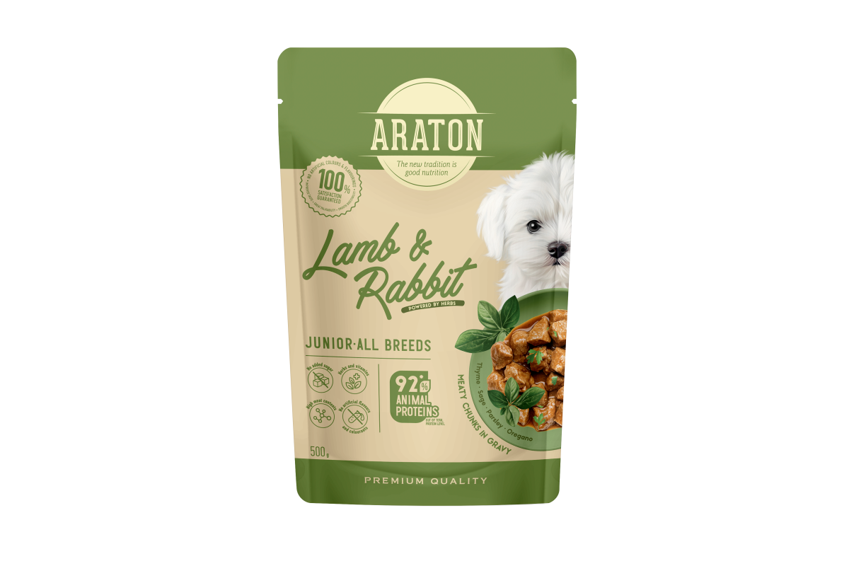 ARATON complete wet food with lamb and rabbit is a daily, reliable solution for young dogs of all breeds.