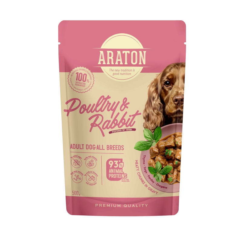 ARATON complete wet food with poultry and rabbit is a balanced choice for adult dogs.