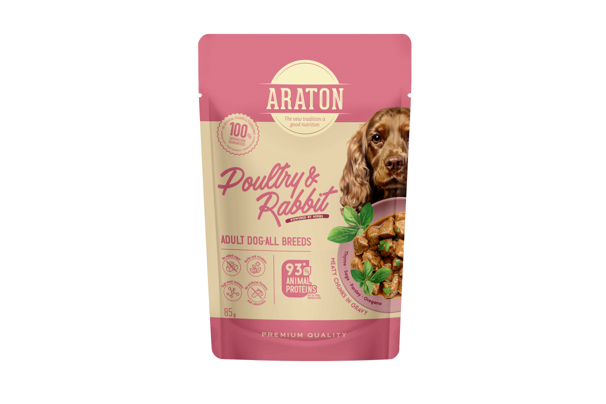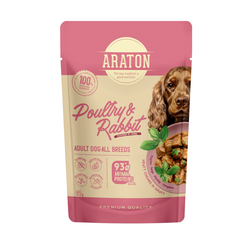 ARATON complete wet food with poultry and rabbit is a balanced choice for adult dogs. When it's not just about taste, but also about daily well-being, this food becomes a reliable solution. For adult dogs of all breeds, it provides essential nutrients, helps maintain healthy digestion, strong immunity and good skin and coat condition.