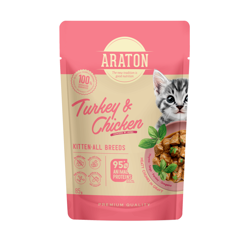 ARATON Complete Wet Food with Chicken and Turkey is a balanced choice for growing kittens. When a small kitten is growing, it's not only important to keep him or her full - every bite must ensure healthy development, strong immunity and easy digestion. This food is designed to help build a strong foundation for your pet from the first months of life.